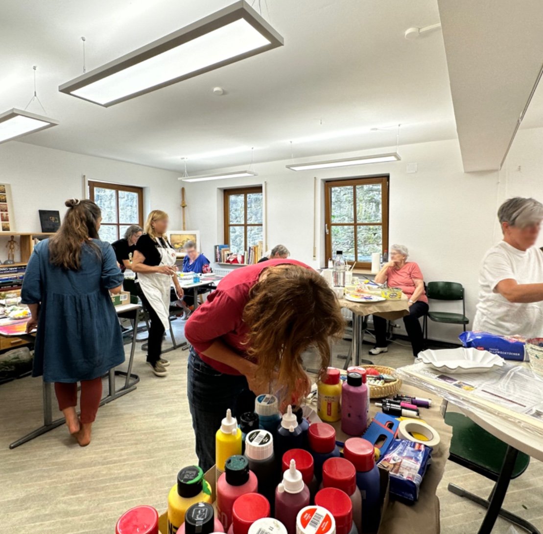 An einem der regelmäßig stattfindenden Erzählcafés findet diesmal ein Kennenlern-Malworkshop unter meiner Leitung statt.