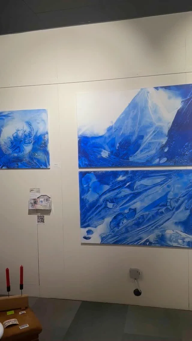 Die Seiten sind hier mit einem der Blautöne aus dem Bild bemalt , jedoch habe ich - wie meist -Momente des Malprozesses stehen lassen.